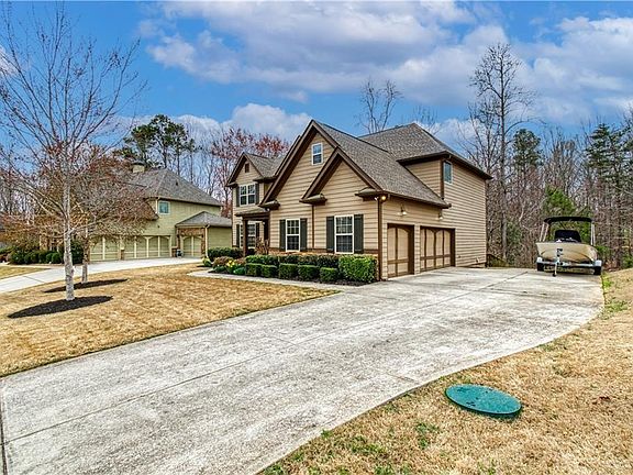 THE PERFECT HOME JUST 1/2 MILE FROM LAKE LANIER! This gorgeous, meticulously maintained home is better than new w/ upgrades throughout every room! Upgrades include flagstone front porch, curved archways, crown molding, coffered ceilings, iron stair spindles, hardwood floors, and the list goes on! The gourmet kitchen boasts canned lighting, granite countertops, 42" white cabinets, and SS appliances which will all stay with the home! The family room has a wall of windows looking out to the private backyard with wooded area and seasonal views of a pond. A stacked stone fireplace with newly installed custom gas logs and built-in bookcases flank each side. Guest bedroom and full bath with private access on the main level. Two additional large bedrooms, a nursery or office, a media/bonus room, and the luxurious master suite are all upstairs. The master suite has tall trey ceilings, tiled shower, whirlpool bath, double vanity and a huge walk in closet. Newly painted master bathroom makes it light and airy! The media/bonus room has French doors and is pre-wired for surround sound speakers. Full daylight unfinished basement w/endless possibilities. The large deck outside has just been freshly stained and is perfect for outdoor entertaining! A 3-car side entry garage and long level driveway allows plenty of parking for your guests and/or a boat! Sellers are open to selling any and/or all furniture in home to Buyer.