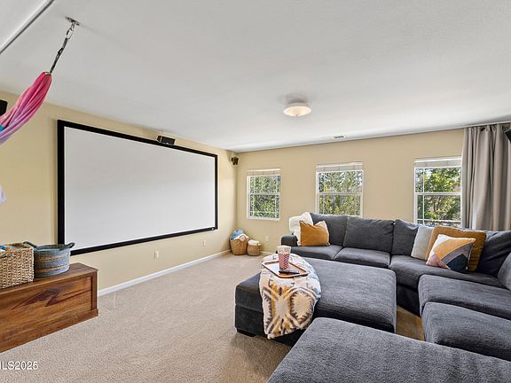 Welcoming, bright and updated with impeccable style: Some houses you view, but this one you truly feel at Home right away in one of the largest floorplans available in the neighborhood. Relax under the pergola and enjoy clear Northern Nevada skies. Play in the shade in the grassy yard. Enjoy a wonderful peach from your own tree. With sprawling entertaining space downstairs and beautiful high ceilings in the entry foyer, the scale of this home is roomy and inviting. Hardwood-look floors in sophisticated dark tones elevate the downstairs. Cooking space and countertops for days with a gas stainless steel range please the chef in your family, while a distinctive island seating three plus a formal dining room seating eight or more make large gatherings a joy and entertaining a breeze. Upstairs your people can all stretch out in a full size theater room with cabling for a projector and premium surround sound. The four ample bedrooms are well appointed with great views with styles from bold to understated. The tandem garage offers gym space or extra storage for a boats or toys as needed. This home has the updates completed as is readily apparent at every turn. Come enjoy, a cut above at 8972 Finnsech Drive. Seller is offering credit towards buyer closing costs with acceptable offer.