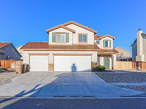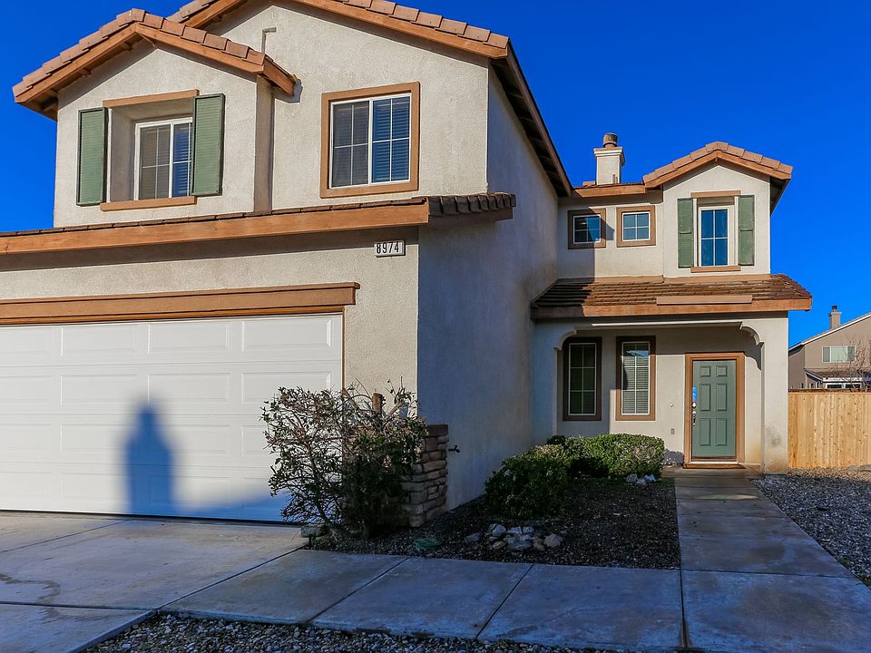 Beautiful 4 bedroom, 3 bathroom, 2 story home with a main floor bedroom in the community of Hesperia! Enjoy vaulted ceilings, an inviting fireplace, an open kitchen, and paid solar panels. The kitchen offers a center island, white tile countertops, a walk-in pantry, and light wood cabinetry. The primary bedroom features a spacious closet, dual sinks in the primary bathroom, a soaking tub, and a walk-in shower. Additional property highlights include the enclosed back yard, 3 car garage, laundry room, and no HOA. Convenient to area schools, markets, and easy access to major freeways!