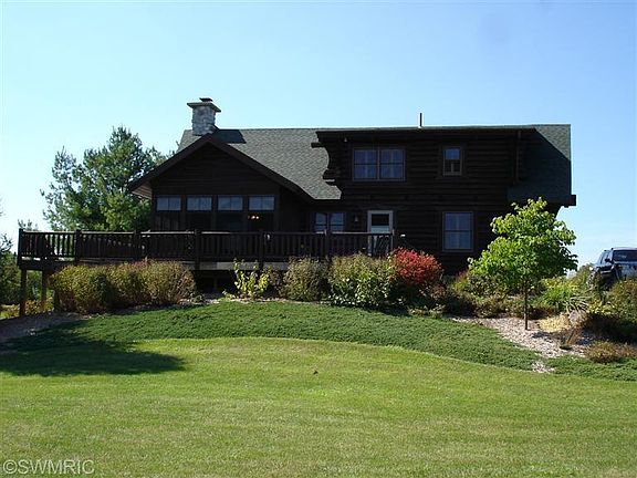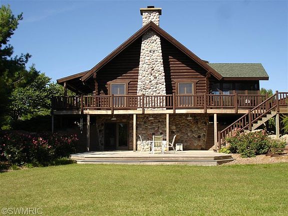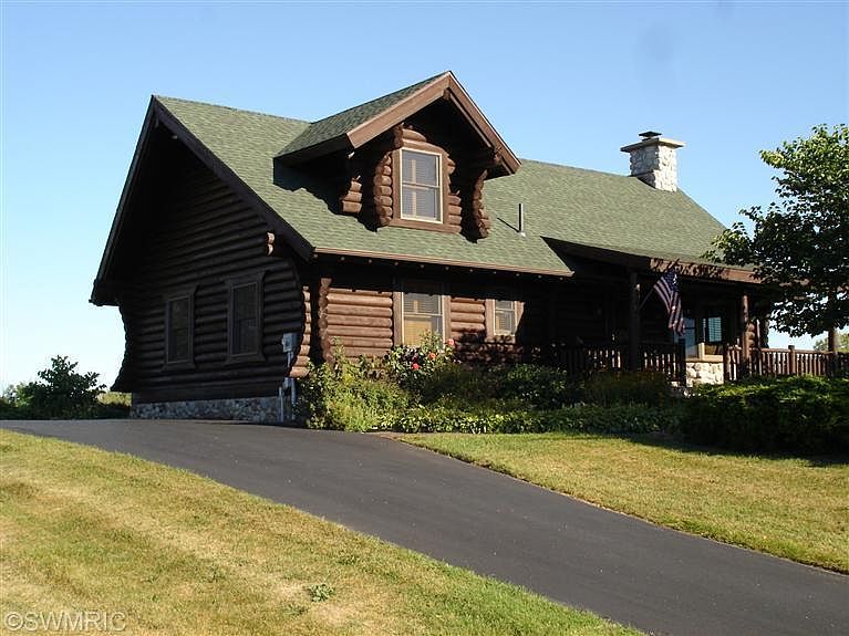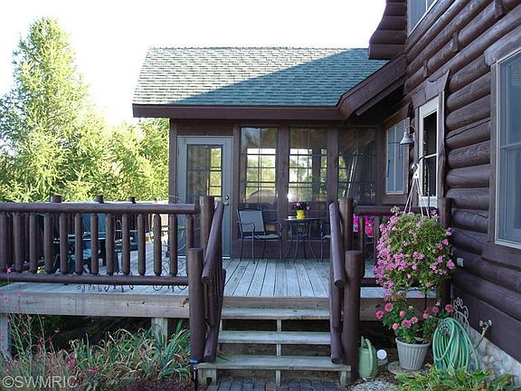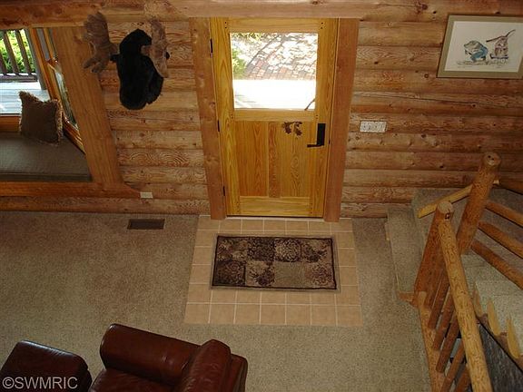 Looking for something special? How about a Rocky Mountain log home at its best? Elevated high on a 5.7 acre country setting overlooking a stocked pond and country comforts beyond, you enter this home from a covered wraparound porch through a custom designed and built entry door by Terry Hanover from The Center of the World in Harbor Country. Two story vaulted ceiling great room is warm, inviting and features a stone fireplace. Entire upper level loft area is a terrific master suite with full bath, walk in closet and loft sitting area. The walkout lower level is set up as a Chicago style tavern complete with a bar that seats 8 and atrium doors out to a large partially covered deck. The lower level full bath features a steam shower for two! Recently added vaulted ceiling three seasons room with Easy Breeze Windows overlooks the back 40 and the incredible 40' X 60' pole barn which is partially heated and cooled. There is a well for the furnace system and outdoor sprinkling.