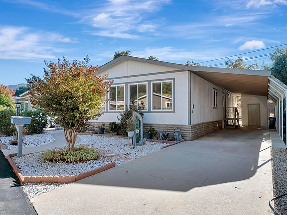 Single-story 2BR/2BA home in the extremely desirable, 55+ resort living community of the ‘Champagne Village’ in Escondido! Golf course, Pools & Spa’s, bocce & sports courts, dog park, on-site RV storage & parking, guard gated entry w/ concierge entry are just a few of the amenities available to homeowners in this fantastic neighborhood! The home features an open floor-plan w/ a huge living room w/ mountain VIEWS & vaulted ceiling throughout the floor plan, giving it a spacious feel & allowing for tons of natural light throughout the whole house! Upgraded w/ Low-E windows & slider throughout, the kitchen has been remodeled & features 2 skylights in the ceiling, fans in every room, a covered front porch & back deck overlooking the spacious, private backyard area just perfect for outdoor dining & entertaining or enjoying time alone. Hardscape upgrades include stamped concrete & secluded seating area w/ fire pit for those relaxing evenings. Other features include Central AC for cooling the interior, full-size indoor laundry for convenience & walk-in closet in the primary BR, covered carport w/ plenty of room for parking, storage & more. All appliances convey. This home affords all the luxuries of the active 55+ lifestyle community of the Champagne Village in North Escondido. It’s a close walk to the Village Hall for the neighborhood gatherings & events, the private golf course & resort-style living amenities & the community is guard-gated w/ no access from outside guests without the owners permission. Monthly HOA fee includes trash & sewer w/ boat &/ or RV parking included inside the park. Home is move-in ready & the best part… there is NO space rent in the Champagne Village as you'll OWN the land your home sits on. Home has a 433-C 'Cert' on-file & recorded with SD County. Come see for yourself!