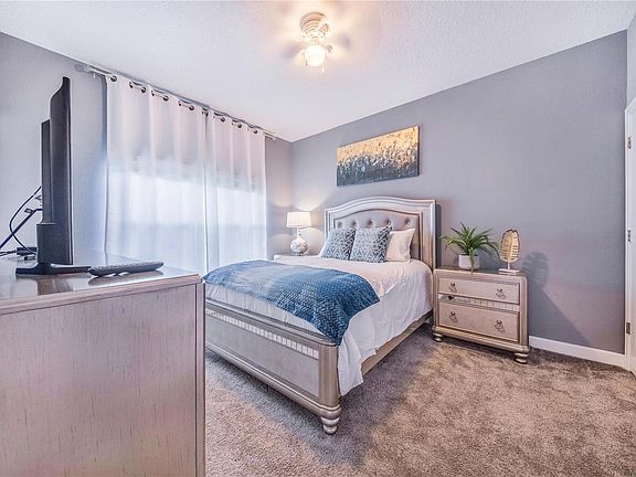 Experience luxury living in this 4 bedroom, 3 bath, 2 story townhome in the desirable Stoneybrook community. Only 4 years old, this fully furnished turnkey home features striking curb appeal. An open floor plan welcomes you with tile flooring in common areas and carpet in bedrooms. The main level includes a guest bedroom with a full bath. The kitchen is a chef's dream with quartz countertops, stainless steel appliances, and an island, opening to a spacious family room that has direct access to a lanai with a pool! Upstairs, the primary bedroom offers a walk-in closet and ensuite bath with dual sinks and a luxurious tub. Two additional bedrooms, another bathroom, and a laundry room complete this level. The screened in lanai and pool provide a private retreat. Resort style amenities include a Lazy River, Swim Up Bar, Fitness Area, and more. Lawn care is included for ease. Discover the perfect blend of style and comfort at 8977 Cabot Cliffs Drive your dream home awaits! Owner allows sublease, Airbnb