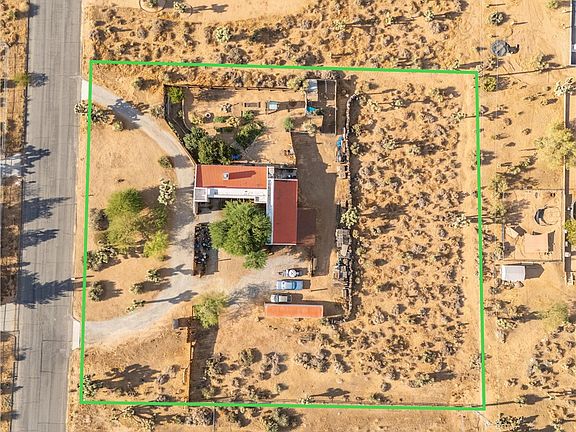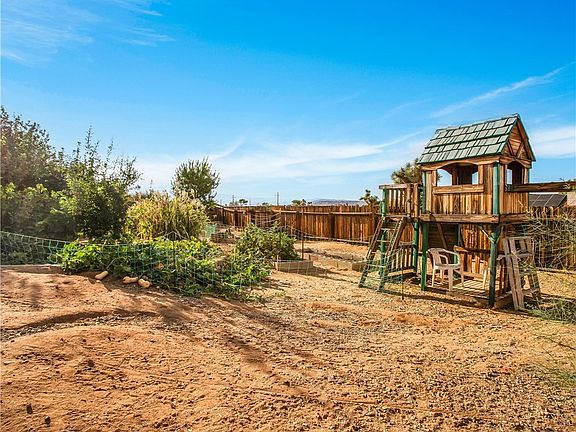 Amazing opportunity with this 1,988 sq ft 3-bedroom, 2-bathroom home, set on 1.4 acres, less than 1.5 miles from Black Rock Campground in the Upper Sky Harbor neighborhood of Yucca Valley. The property features a large circular driveway and mature landscaping, providing both privacy and tranquility. Inside, enjoy spacious living areas with large archways and high vaulted ceilings. The living room and dining room share a double-sided standalone fireplace, perfect for cozy evenings. The kitchen includes tile countertops, an open view into the living room and dining area, and a separate tiled bar for casual dining. The primary bedroom is very large and offers high ceilings and even a wood beam, walk-in closet and a large bank of windows that flood the primary bedroom with natural light. The ensuite bathroom features dual sinks, a separate sit-down vanity, and a shower-tub combo. The two additional bedrooms are also large and offer views of the backyard. The second bathroom is conveniently located for guests and the additional bedrooms. For added comfort, the home is equipped with both central air conditioning and an evaporative cooler. Step outside to a fully fenced backyard, where you’ll find a lush garden with raised beds growing corn, pomegranates, apples, and more, along with outdoor playground equipment. Additional highlights include a storage room accessed from outside, ample parking, and plenty of space to enjoy the peaceful desert surroundings. This home is a must-see!