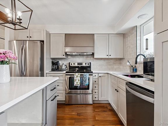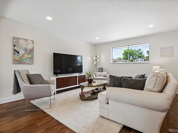 Welcome to this completely remodeled 4/2 home located on a large corner lot in one of the most desirable areas of Arvada. Seated just down the street from Club Crest Park, this spacious bi-level home features all new designer finishes. Inside you'll enjoy an open kitchen with quartz counters, shaker cabinets, italian backsplash and stainless steel appliances. All new wood floors can be found throughout the home. This property features tons of custom features such as white shiplap, wrought iron railing, recessed lighting, pendants and chandeliers, trim, tile and more. There are two bedrooms on the upper level, the bathroom offers en-suite access to the primary. On the lower level there are two additional bedrooms, a full bathroom, a secondary living area with a gas fireplace, as well as a laundry room. Out back you'll enjoy a large deck with a retractable awning, a huge backyard with a storage shed, and updated sprinkler systems. An addition was added to the side of the garage which could be perfect for a shop, studio or finished into a home office space.