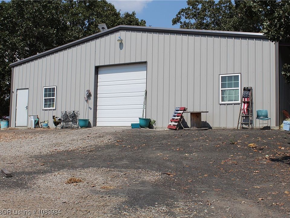 The property boasts a charming 2,000 sq ft shop house, also known as a barndo, complete with a 12 ft lean-to. Inside, you'll find a comfortable 2-bedroom, 1-bath living space with a dedicated laundry room. The open floor plan showcases polished concrete floors and a gorgeous, rustic kitchen, featuring a tin backsplash, butcher-block-style counters, and elegantly antiqued white cabinets. The concrete floors are easy to maintain and gleam with minimal effort. The spacious open area is perfect for family gatherings and entertaining. A pellet stove provides efficient heating, while central AC/heat ensures year-round comfort. This property is a perfect blend of functionality and rustic charm! A well on the property provides the water.
