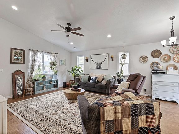 Close to town with a country feel this 2021 open concept home has granite counters, vaulted ceilings, a pantry, RV parking and hookups. Bonus parking with a fenced yard, automated sprinklers, GPID irrigation, chicken coop and run. Plant your own fruit trees and garden in the back and sit on the patio and enjoy the sunset and views!! This is a must see at a great price!