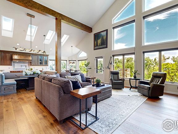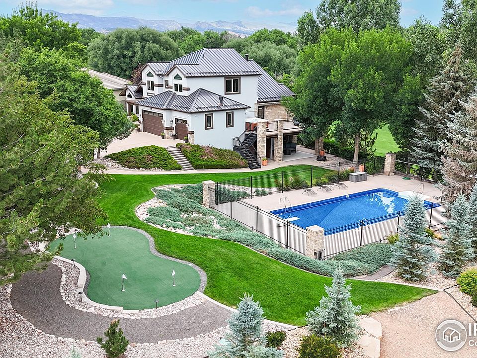 ACCEPTING BACKUP OFFERS. Like new main floor primary bedroom two story with over $850,000 in upgrades. One-of-a-kind 0.60 acre walkout double lot at the end of a cul-de-sac with putting green and pool backing to 15th Fairway and Big Thompson River with foothills, buttes, and Oxbow natural area views. Home features newly painted stucco exterior, metal roof, three deck/view areas, and separated third car bay with workshop. Open main floor w/ vaulted ceilings, skylights, exposed beam accents, fireplace, built-in media center & bookshelves, built-in dining area w/ table & bench, office, and mud room with lots of built-ins. Gourmet kitchen Jenair appliances incl. oversize gas range/oven w/ griddle and vent hood & pot filler. Two kitchen sinks incl. built-in walnut butcher block counter, beverage fridge, walk-in pantry, and more. Main floor primary bedroom w/ built-in floor to ceiling cabinetry & bay window, and access to private deck. Primary bath features heated floors, large walk-in shower, dual vanities, custom closets, and washer/dryer. Upstairs includes art studio/craft room/office overlooking main level, two bedrooms, and full bath with extra depth soaking tub. Fully finished walkout basement featuring full second kitchen and bar, rec room, movie/tv area with fireplace & built-ins, two bedrooms, bathroom w/ stackable laundry, and exercise/flex room. Mariana Butte is an internationally renowned 18 hole golf public course featuring challenging terrain, river & water features, and views of area hogbacks & foothills. Recreational trails including Mariana Butte Nature Trail along area hogbacks & Oxbox Natural Area. Enjoy non-motorized lake activity at Boedecker Lake, hiking at Devil's Backbone, biking up the canyon on Hwy 34, or going for a night out in Downtown Loveland. Nearby Safeway & King Soopers offer convenient shopping options. for more information.
