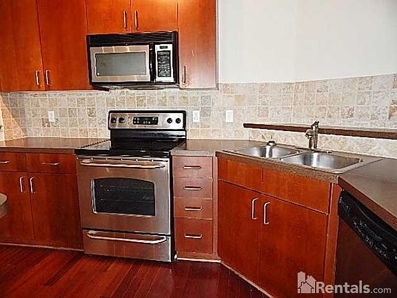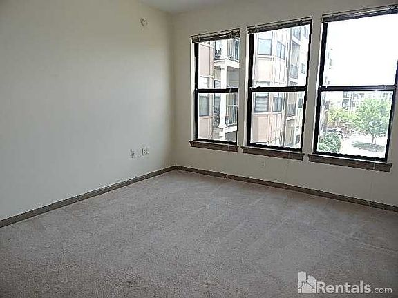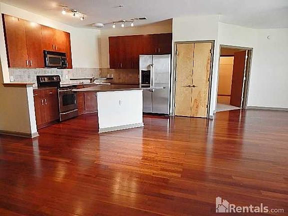 The living area is spacious in the bright, open home in Sky Lofts. Stylish kitchen with sleek cabinets, stainless steel appliances including stove, refrigerator, microwave and dishwasher, tile backsplash and granite countertops. Living/dining with open concept feature hardwood floors and a curved wall. Washer/dryer included in laundry. Gated complex includes pool, fitness center and bbq area. 2 garage parking spaces included in rent. Pets allowed with $150 refundable pet deposit + $150 pet fee. No aggressive breeds.