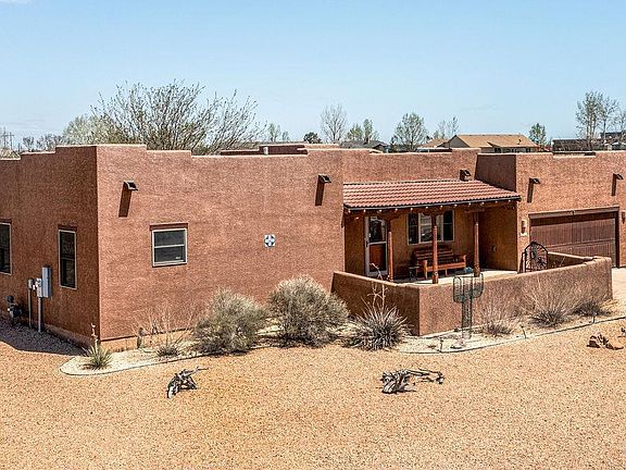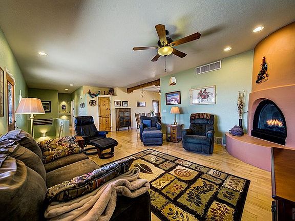 Wonderful southwest styled rancher with Kiva shaped fireplace, front stucco courtyard with decorative metal gate, exposed wood beams, sw style interior pine wood doors, 3 leaded glass doors (including one from master bedroom to back deck), arches, art niches, and sw coloring tastefully done! Attractive wide wood plank floors on the main floor, newer carpet in two main floor bedrooms, hickory kitchen cabinets, tiled bathrooms and laundry room, with laundry tub. Well landscaped around the house with interesting rocks, trees and shrubs. Both the front and back have covered seating areas (front concrete and back a trex deck withj Pikes Peak wintertime views), so pick your spot based on the weather. Backyard has a nice-sized area fenced in, with the man door entrance to the detached building inside this yard. Outbuilding is 24 x 32, with a new concrete floor, and the large door is 11.3 feet tall and 12 feet wide, so a good-sized Class C motorhome fits nicely in here. Kitchen has granite counters including a table height section for additional eating space near the dining area table, and subway tiled backsplash, plus pantry. Ceiling fans throughout. Basement is mostly finished with a large family room, possible ping pong or pool table area, private office nook, large bedroom and bath, plus two unfinished storage rooms. Immaculate home, ready for you! Nice neighborhood, and about 3 blocks from Cedar Ridge Elementary.