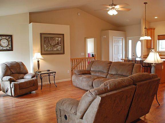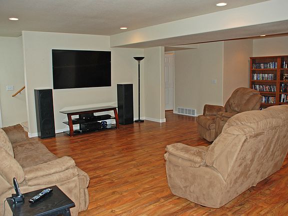 Beautiful wood floors upstairs and downstairs. New carpet in each of the bedrooms. Huge finished garage that will fit 5 cars. New roof, vinyl siding, and garage doors. Vaulted ceiling in the main room with recessed lighting. Very large storage room downstairs that could be converted to another bedroom. Corner lot. Mature landscaping in both front and back yards, with automatic sprinklers. Extremely well cared for.