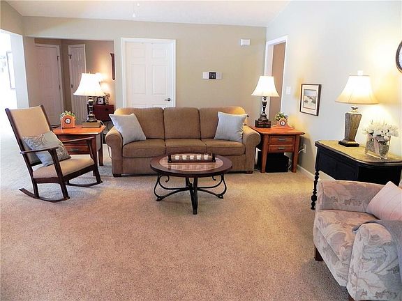 Fabulous all brick patio home in 55+ community offering an open floor plan that is wonderful for entertaining . . . snow removal & lawn care incl in HOA fee. TV bracket over fireplace in place, handicapp accessible. Private double master suites, both w/ large walk in closets. One MSTR offers a wonderful walk in shower and double basins and linen closet. Water softener and filtered water at kitchen sink, stainless steel kitchen appliances. New neutral carpet in great room, dining room and hall June 2017, gorgeous hardwood flooring new in 2015 in kitchen and entry. Glassed rear sunroom, private and inviting! Move in ready!