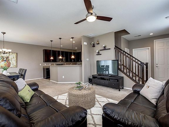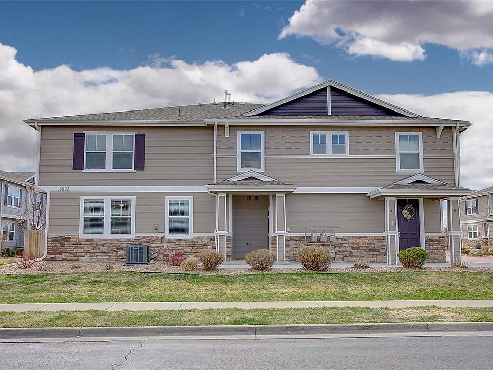 Don't miss this spacious 2 story Townhouse in Prairie Meadows. Sunny end unit with plenty of windows and open concept family and dining room. Main floor has large kitchen w/upgraded 48 inch espresso cabinets, stainless steel appliances, breakfast bar, over sized 2 car garage, mudroom, powder bath, main floor laundry, fenced in patio and air conditioning. Upstairs you will find the master bedroom w/en suite bathroom, 2 additional bedrooms share another full bathroom. Easy access to Cherry Creek trail, playgrounds, volleyball court, schools, shopping and E-470.