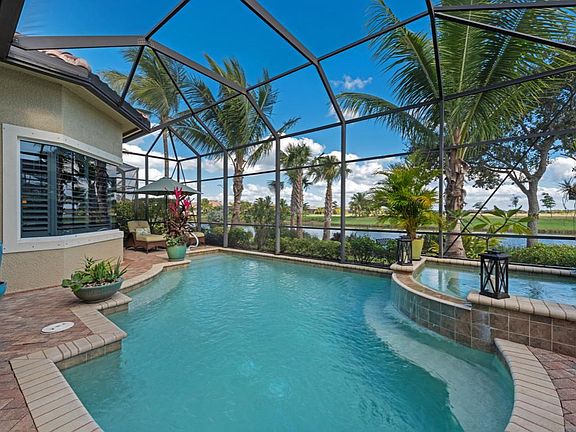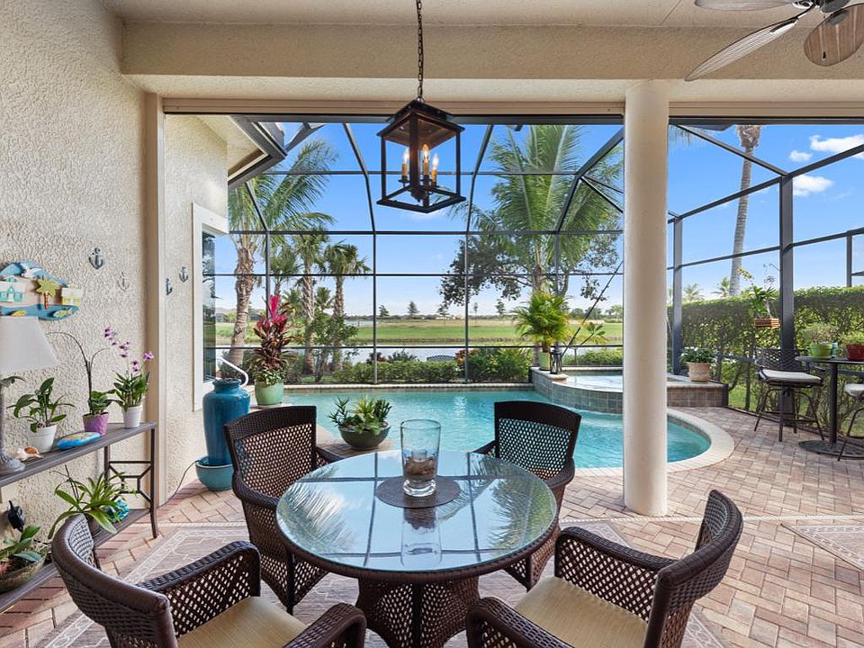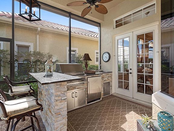 Welcome to this lovely three-bedroom, three-bath cabana home with fantastic lake views. This gorgeous home has numerous upgrades and updates, including 18-inch tile and natural wood flooring in the three bedrooms. New light fixtures, coffered ceilings with crown modeling, and plantation shutters. The open eat-in kitchen features tall cherry cabinetry with new granite countertops and backsplash. The refrigerator and dishwasher have a cherry wood-paneled front. The microwave and oven are two years old. Excellent floor plan for entertaining with a separate spacious formal dining area with an adjust sitting area with butlers pantry. The expansive lanai hosts a gas heated pool and spa with a waterfall feature â lots of additional room for entertaining or simply enjoying the magnificent lush landscaping and lake view. The custom outdoor kitchen enhances the outdoor living area. One of the master bedroom closets has a custom organizer. The master bathroom has updated shower tiles and new vanities with granite.There are storm shutters for the windows and sliders and an electric roll-down shutter. Fiddler's Creek is an award-winning community. Optional golf and marina membership available