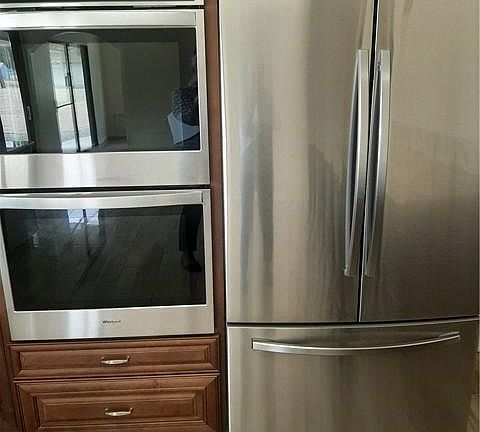 BIG OPEN KITCHEN WITH BRAND NEW STAINLESS APPLIANCES, INCLUDING REFRIGERATOR. KITCHEN IS EAT IN WITH LARGE COUNTER WITH GRANITE AND STOOLS