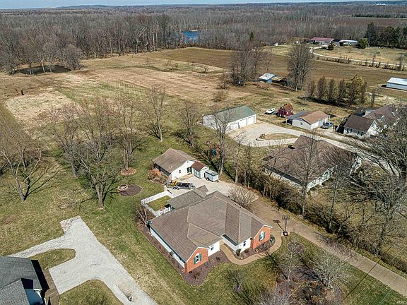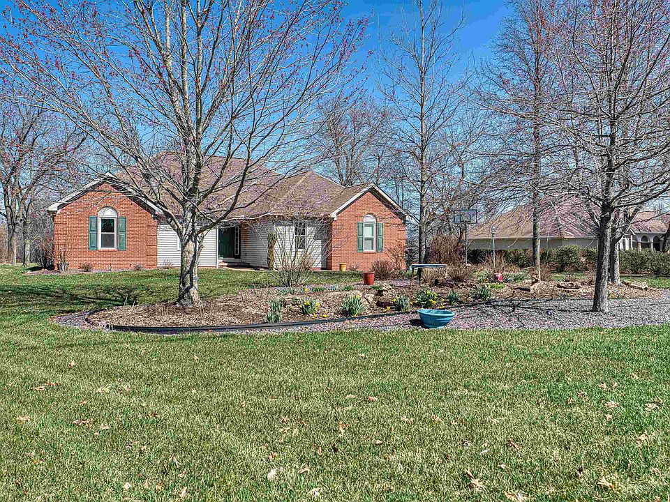 Stunning Custom Home on 2 Acres - Just 10 Minutes from Evansville! This exceptional custom-built home offers the perfect blend of luxury, comfort, and convenience. Nestled on a picturesque 2-acre lot, the property boasts impeccable craftsmanship inside and out, surrounded by beautifully manicured landscaping and breathtaking views. Step inside to an open floor plan designed for effortless entertaining and cozy family gatherings. The grand entrance features ceramic tile flooring and a decorative storm door, setting the stage for the elegance found throughout. The spacious living room showcases a tray ceiling, extensive crown molding, detailed door moldings, and stunning columns that elegantly define the great room. The spectacular kitchen is a chef's dream, featuring solid cherry cabinetry, a five-burner gas cooktop, a large prep island, recessed lighting, and a beautifully lighted corner cabinet. A dedicated coffee bar area adds both style and convenience. Just off the kitchen, a newly added sunroom provides the perfect spot to relax and take in the serene backyard views. The private primary suite offers a luxurious retreat, complete with an upgraded bathroom. Down the hallway, the third bedroom is thoughtfully designed with a closet located in the hallway for added space. Outdoor Features & Workshop Space. This property is designed for both beauty and functionality, featuring: 8x10 storage shed for extra space. Leaf guard rain gutters for low-maintenance upkeep. Expanded gravel parking area for additional convenience / Fenced-in area perfect for pets. A true highlight of this home is the approx. 30x32 outbuilding, converted into a fully insulated, heated, and air-conditioned workshop. This space includes: A woodworker's dream setup with a dedicated studio area. Half-bath for added convenience. Endless possibilities—must see to appreciate! The sprinkler system extends from the street to the back of the shop, with capabilities to add mosquito repellent for enhanced outdoor comfort. Experience country living with city convenience just 10 minutes from Evansville! This is a rare opportunity to own a truly remarkable property.
