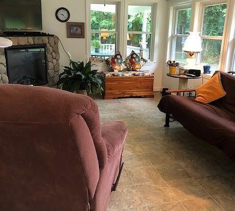 Home features large sun room with fireplace, covered porch on side and one across front over looking pond, large storage building wired