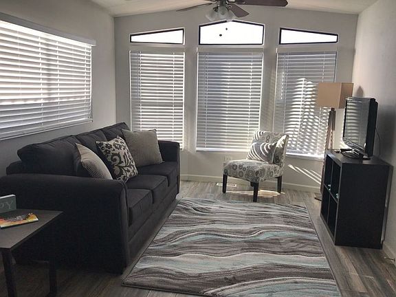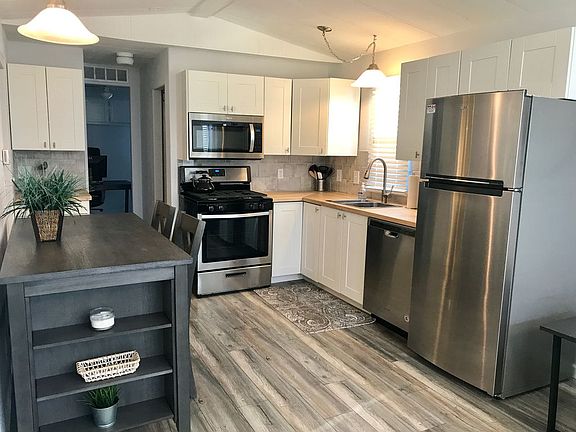 Completely gutted, redesigned and remodeled Park Model that looks and flows like a new modern home. Large Arizona Room addition with full bath. New wiring, plumbing, insulation and drywall throughout. Thermopane windows with blinds and Thermopane entry doors with enclosed shades. Luxury Vinyl floors and beautiful kitchen with Butcher Block counter tops. All New/Full Size Stainless Refrigerator, Dish Washer, Gas Stove and Over Stove Microwave. Large full size bath with double sink vanity and walk in tiled shower. Inside utility room has W/D hook up and sink (easily converted to additional half bath). Lots of closet space including a pantry. Hardie Plank siding outside with a 8' x 16' Trex front deck. Shed with full size washer and dryer and storage. Full Size Gas Water Heater. Manufacture warranties on all new appliances and a Home Owners Warranty is provided by the seller.