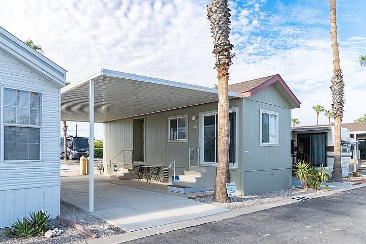 Amazing roomy Unit 34 is a Silver Crest 2022 unit made by Silvercrest Homes. The front living/kitchen area is unique in that there are a lot of kitchen countertops built on the side of the unit which gives you this open feeling and lots of room to walk around, a good social unit. The lighter countertop color maximizes the dark cabinets. Just Wow! As you walk down the hall the bathroom offers a step-in shower with a nice vanity with good storage. As you look on your left the unit is plumbed for a stackable washer/dryer. The full-length closet offers you so much storage. What a lovely unit. To see this in person give us a call, it's a gem. This unit is located in Rincon Country East RV Resort, 8989 E Escalante Rd, Tucson, AZ. Oh, you want an Arizona Room? Ask your sales agent about the wild offers available right now.