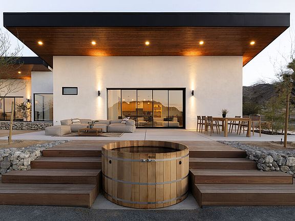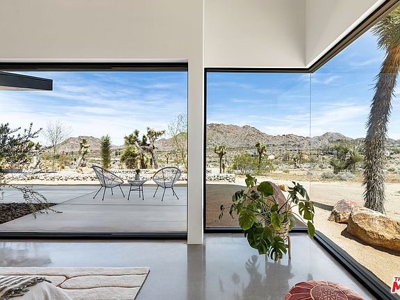 Contemporary Desert Masterpiece: Classic butterfly roof design with a 15' tall soaring eve gracing the front of this meticulous new construction. The tall eves, providing shaded outdoor space, when combined with a 15' wide disappearing sliding-glass wall create an authentic indoor/outdoor living experience. Step into the redwood hot tub out front, with a majestic boulder mountain, perfectly framed through the massive glass wall when viewed from inside the spacious Great Room. Formal entry is through an 8' tall by 4' wide pivot glass door. The custom kitchen showcases a massive quartz double waterfall island and hand-built cabinetry, allowing for an ideal social space with the dining area and kitchen filling out the rest of the Great Room. One reaches the en suite primary bedroom down a long glass encased hallway. The primary bedroom also features an unobstructed frameless cantilevered corner window utilized by Frank Lloyd Wright in the Ennis House built in the Hollywood Hills exactly a century ago. The primary bathroom features a nearly 6' by 10' massive window looking out at the mountain range to the south, while the guest bathroom has a door opening to an exterior platform, for a total of 3 full baths and 3 bedrooms spread over 2,287 square feet of interior living space. Inspired by midcentury design throughout, each room features endless glass, illuminating the interior and looking out over vast wilderness in every direction. Tucked up near the Joshua Tree National Park on a large 2.5-acre parcel, one can hike from home into the Park or drive to the main entrance gate a short distance up the road. Located in the coveted Monument Manor/Joshua Highlands neighborhood, often referred to as the Bel Air of Joshua Tree, the location offers privacy, prestige and convenience for those seeking serene wilderness surroundings.