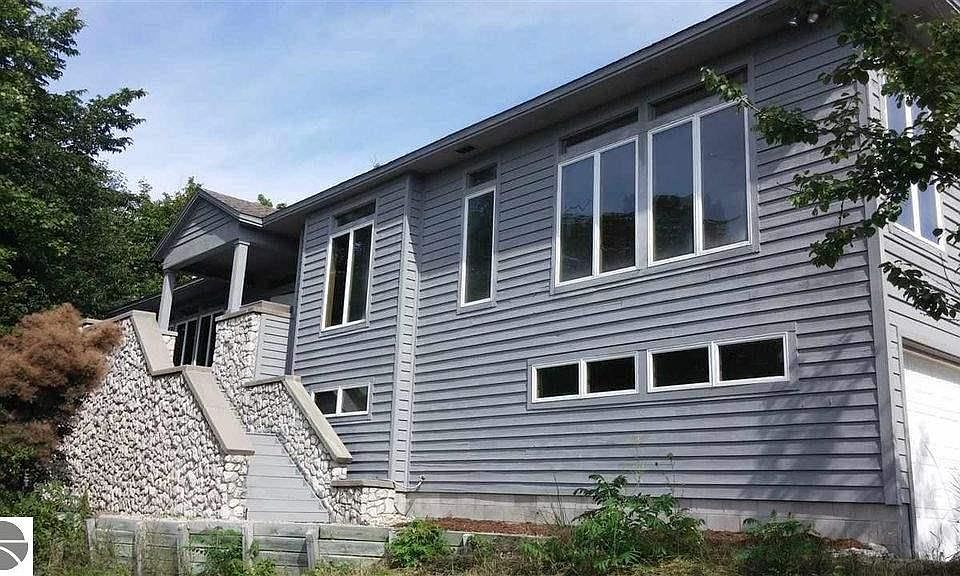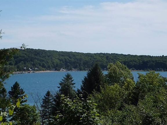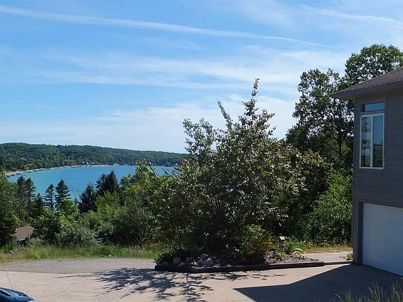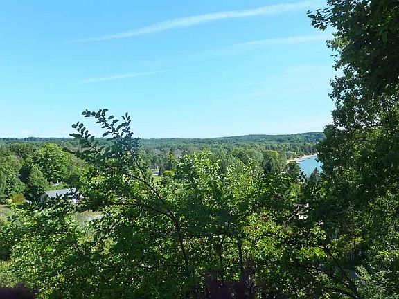 Perched on a hillside this contemporary home offers sweeping views including the blue waters of Crystal Lake. Well maintained raised ranch features a spacious living room w/wood floors & a stone surround fireplace. Large kitchen for the cook w/ breakfast nook. Formal dining area. Master suite w/large walk in closet & bath w/shower & whirlpool tub. Also a back sunroom w/heater for all year use. Stairway features a handmade Austrian glass window. LL has 2 large bedrooms & full bath. Attached garage & workshop. Also an upper level storage room. Enjoy the outdoors on the wrap around deck. A/C for those warm summer days. Private setting perched over the village of Beulah. Walk to Crystal Lake & village amenities. Close to lakes, golf, skiing & Lake Michigan.