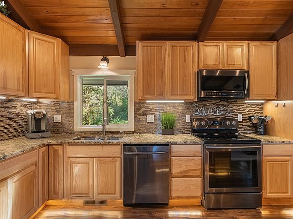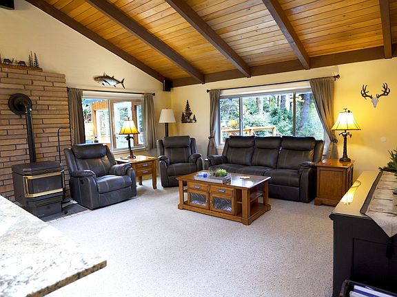 Here's the one you've been waiting for! Located in Florence's coveted north end this 6+ acre property, lovingly cared for is as clean and tidy as they come. The property features a paved driveway and stamped concrete with a natural landscape that is easy to maintain. Walking paths wind past the creek and through the forest with ferns, alder, old growth spruce and douglas fir trees. The home has a very functional layout with many recent updates. Vaulted ceilings with tongue and groove fir and beams complement the natural setting. A wrap-around deck with new Trex decking includes covered portions for year round enjoyment. Additionally, two shops provide ample storage to keep all your equipment and toys, while a greenhouse with raised beds and new polycarbonate sheeting highlight just a few of the special features this property offers. Don't miss this opportunity for living the Oregon Coast dream.
