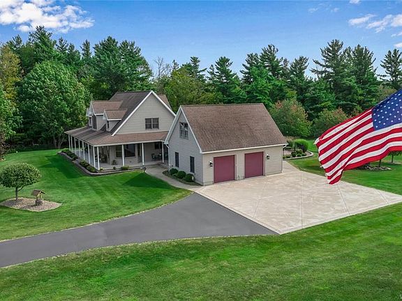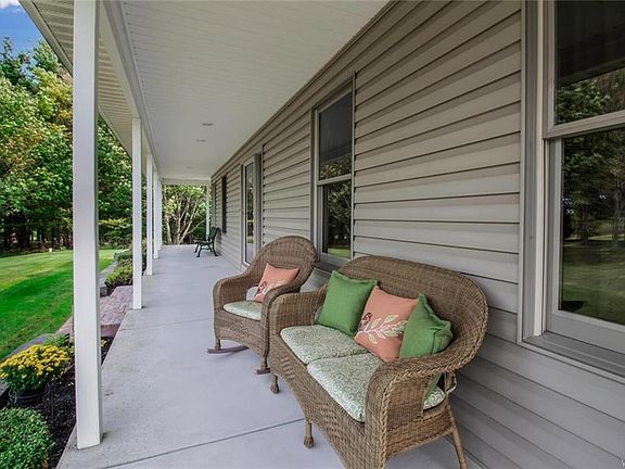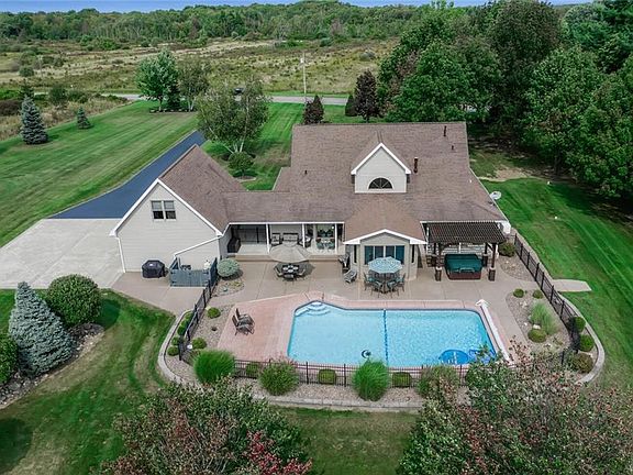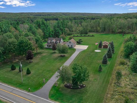 Picture Perfect 1998 built, 3 bedroom 3.5 bath home situated on over 3.5 acres in Colden. Enjoy your summers on the wrap around concrete porch, or by the fenced-in, in ground pool area-with hot tub and spacious concrete patio. Additional picnic pavilion with stone wood-burning fireplace. Inside the open living area includes living room with custom built in shelves surrounding gas fireplace. The first floor master suite has a jacuzzi tub and stand up shower. There is a formal dining room, large eat in kitchen with center island and family room overlooking pool area. The second floor has lofted hall overlooking living space and 2 large bedrooms. Don't miss the fully finished basement complete with wet-bar, full bath and walk out to the outdoors. The 2.5 car garage has additional second floor- perfect for additional rec area, office away from the house of just great bonus storage. A short drive to Colden or Village of East aurora. Some bonuses include 2 sheds and permanent generator. Don't miss this first time offered.