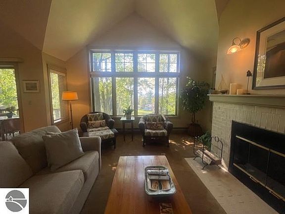 Quarter ownership with 12 weeks per year. Take in scenic views of Lake Michigan, the Sleeping Bear Dunes and the Brook Hill Pond from this upper level end unit with high ceilings and spacious open living area, two bedrooms and two bathrooms. Features large kitchen, dining deck, private owner storage, washer/dryer, wood burning fireplace and Jacuzzi tub in the master suite. RCI membership is optional so you can trade weeks here for weeks elsewhere around the world. With quarter ownership, you are deeded 12 week per year, including two, two-week warm weather stays. Association fees of $358 per month cover all condo expenses except for property taxes and Club membership. No pets allowed.