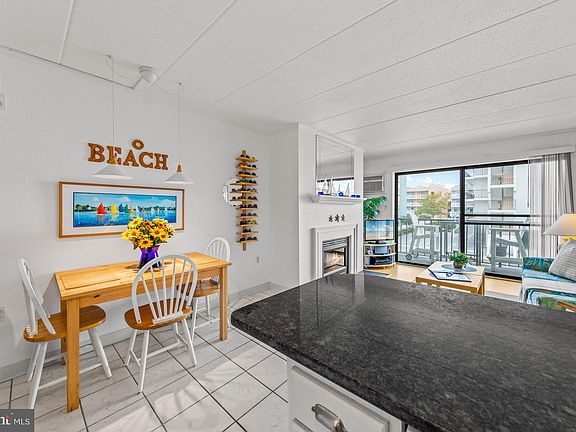 This exquisite Ocean-block, 1 bedroom, 1 bath condo is a tranquil seaside retreat that offers the perfect blend of coastal elegance and modern convenience. With beautiful views of the Atlantic Ocean from its private balcony, this Ocean City property is a haven for those seeking a beach convenience lifestyle. Upon entering, you'll be greeted by a soothing and neutral coastal color palette that sets the tone for a relaxed and inviting atmosphere. The condo boasts an open-concept design, seamlessly blending the living, kitchen, and dining areas into one open and airy living space. Sunlight streams through the large glass sliding door, illuminating the interior and enhancing the serene coastal ambiance. The living room features a cozy fireplace that adds warmth and is a place to gather. Step out onto your private balcony to savor the mesmerizing views of the ocean and endless horizon. Whether it's morning coffee or sunset cocktails, this balcony offers an ideal spot to unwind and enjoy the ocean breeze. The kitchen is complete with a breakfast bar island, granite counters, and ample cabinetry. It's perfectly designed with an open connection to the living and dining areas. The spacious bedroom is a serene oasis with coastal-inspired décor. It provides a restful sanctuary after a day of beachfront adventures. The attached bathroom provides dual access from the hall. For added convenience, this condo is being sold fully furnished, making it turnkey for your immediate enjoyment and rental potential. A ground-level storage unit is included, providing ample space to store beach supplies, bikes, and more. The building features a newly installed roof and 1 assigned parking space with plenty of guest parking available. Experience the epitome of coastal living in this tastefully designed condo with ocean views.