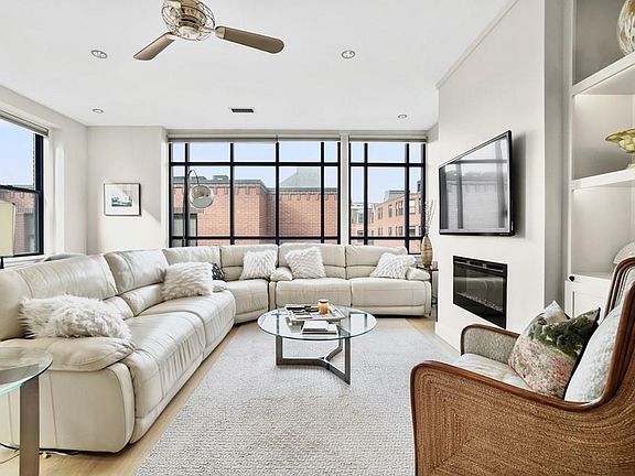 Sun-filled & stunning corner one bedroom with garage parking on the fourth floor of a desirable elevator condo building designed by local architect Graham Gund. This gorgeous, well-thought out unit has oversized windows, all outfitted with electric shades, that allow for an abundance of natural light that fills up the living room/dining room/kitchen. The spacious living room features handsome built-ins, recessed lighting, an electric fireplace & plenty of space for a large dining room table. The lovely cook's kitchen has an abundance of cabinets/counter space, a breakfast bar, gas cooking & recessed lighting. The generously-sized master bedroom has a whole wall of closets that are built-out, floor-to-ceiling custom built-ins & double doors that open into a charming home office area. Recently gut-renovated bathroom feat. Bosch washer/dryer, lg linen closet, front-lighted LED vanity mirror, oversized glass-enclosed, tiled shower. Direct-access to 1 full garage parking space. A must see!