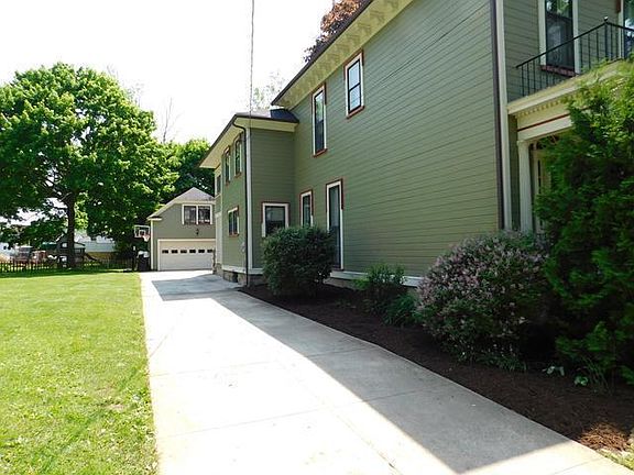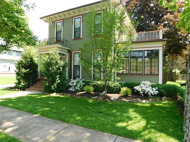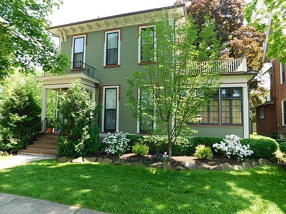 Grand Historic Home in the downtown area. Grand entry with hardwood floors. French glass doors to the formal living room with hardwood floors, crown molding and gas fireplace. Sunroom/office with access to the patio. Large dinning room with hardwood flooring and crown molding. The large updated kitchen with ceramic flooring, stainless steel appliances, 5-burner cooktop, double oven and even a wine refrigerator. Eat-in bar area with plenty of countertop space and lighting. Pantry area with ample storage space and powder room with ceramic tiled flooring. On the back of home is a family room with wall to wall carpeting and skylights. Large bedrooms hardwood flooring and closets. Master bedroom with cathedral ceilings with skylights to enjoy the stars. Built-in dressers and large closets. Master bath with tiled flooring and marble counters. Basement area does have ample built-in storage. The detached garage does have useable space. Garden shed is included! Professionally Landscaped!