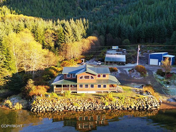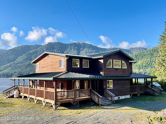 Don't miss out on this amazing oceanfront home! It boasts 4 large bedrooms, 3 bathrooms, 2 family rooms, and sits on 1.5 acres of prime real estate. Located on the quiet side of Port St. Nick Road, this home features a state-of-the-art kitchen and in-floor heating. Thoughtful features throughout the home include top-of-the-line appliances, wrap-around covered decks, and a wrap-around drivewayOther highlights of this 5+ plus energy rated home are built-in desks, ample closet and storage spaces, laundry rooms on both floors, a jetted tub, and a large pantry. The property offers breathtaking water and mountain views from its three-tiered, mostly level lot. With installed creosote pilings on your 143' of pristine ocean front, you have a head start to complete your deep water dock. An outdoor wood shed houses the wood boiler system and offers easy access to the water filtration system. The spacious 1100+ square foot garage and 40'x16' carport provide plenty of room to store your boat and equipment for your next Alaskan adventure. Additionally, the property includes a charming chicken coop, smokehouse, and raised garden beds, promising amazing sunsets. No property tax! This home truly has it all - don't miss this opportunity!