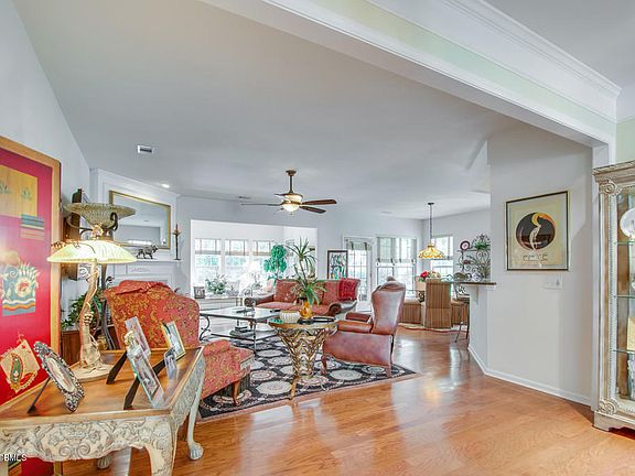Lovely Chestnut Garden, 3 BR/2BA w/den, Fireplace, garden room, screened lanai, formal dining and breakfast area, gourmet kit w/SS apps, granite countertops, island and HW flrs. Carpet in all BR's, 18'' tile in baths, laundry room and sunroom, trey ceilings in MBR and DR, Grill in patio w/gas line, 4 ft gar ext, TechShield Barrier and attic storage! Situated on a large private wooded lot. Fabulous Del Webb community offers wonderful amenities. MUST SEE!