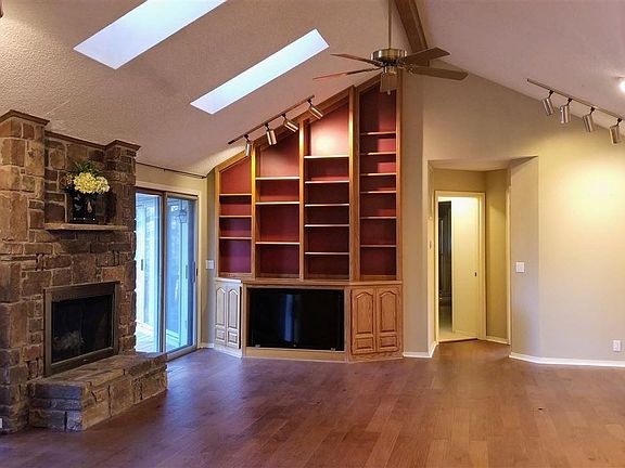 Don't miss this lodge style home on quiet cul-de-sac in the Village! Enter into a large great room with stone fireplace, built-in bookcases and gorgeous 5" distressed wood flooring. Double patio doors lead out to generous deck overlooking a lovely woodsy setting. Open concept design features an efficient kitchen with top of the line Samsung stainless appliances, breakfast bar and separate dining area. Two master bedrooms flank the living area, each with their own private bath. Large laundry room w/sink.