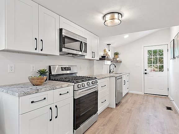 Transformed. You'll love this beautiful remodel with new white shaker kitchen, leathered blue dune granite, gas stove (who doesn't love to cook with gas), stainless appliances including a refrigerator, recessed lighting and packed with storage space, pantry cabinet, trash drawer, black hardware, black faucet/stainless undermount sink and gray floors. The bathroom is all new with striking tile floors, new fixtures, vanity, lighting, exhaust fan. The main living area has a shiplap accent wall and shelving. The stairway wall is the perfect spot for your wall mount TV (power on the wall too). Upstairs you'll find 2 modern bedrooms, upgraded carpet with plush pad, new door hardware, new black ceiling fans, and lots of windows/natural light. Don't miss the finished heated basement with private entrance makes a private home office, workout area, or storage. The yard is fenced with a sprawling rear deck that sits off the kitchen for enjoying warm nights. Nothing to do but move in and enjoy!