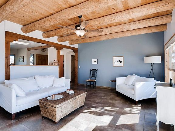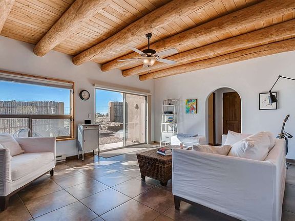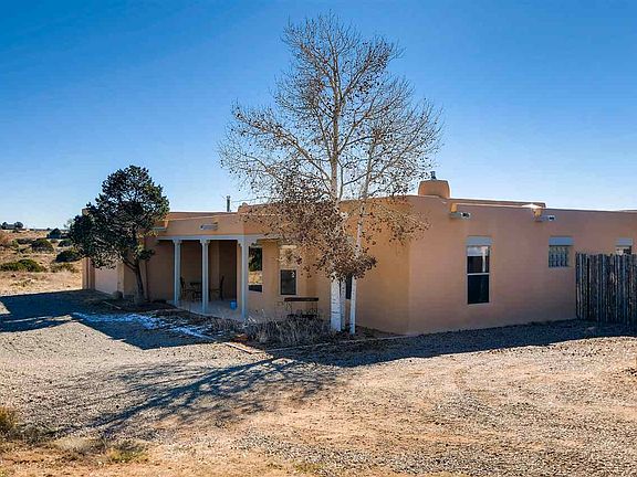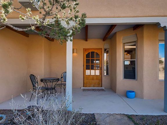 Sunny Eldorado Passive Solar! Super bright contemporary passive solar 3 bedroom, 2 bath built by Sierra Homes bordering a greenbelt. Stucco maintained and roof upgraded in 2018. Refreshed kitchen including natural gas range, remodeled master and guest bathrooms. Cork flooring in master, tile throughout the rest of the home. Hunter Douglas blinds throughout and the living room has a stove pipe for a fireplace or heating stove. The patio and garden area is fenced for privacy and views, plus a "catio". A 2 car garage plus extra parking for guests. This home is close to paved access to senior center, library, shopping and Eldorado Amenities and minutes into Santa Fe.