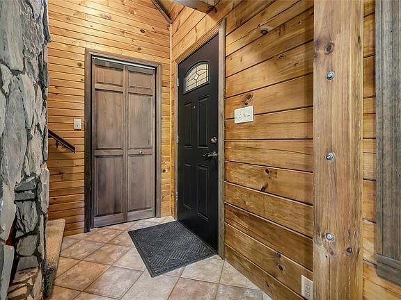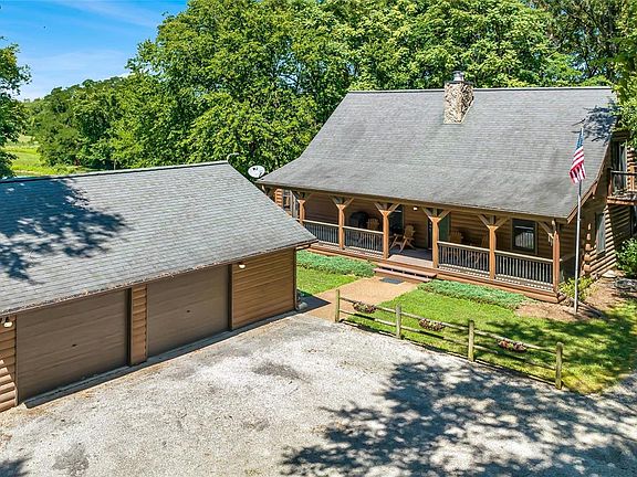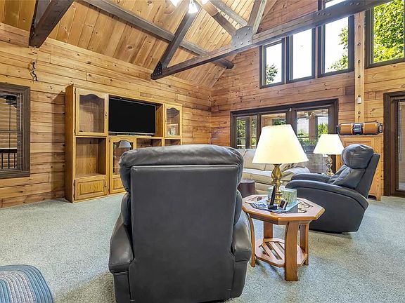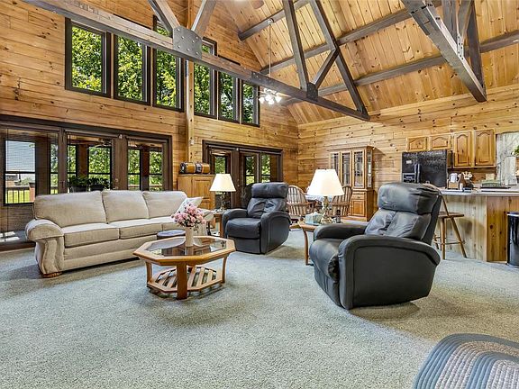 Wow!!! This incredible 3-bedroom, 2.5-bathroom log cabin, nestled on 3.15 picturesque acres with stunning lake views & access, is sure to please. Step into the inviting living room, showcasing vaulted ceilings, exposed wood beams, and a striking floor-to-ceiling stone fireplace – perfect for cozy evenings. The kitchen is a chef's delight, boasting a center island, solid surface counters, and a delightful dining area. Retreat to the primary bedroom, complete with a private balcony and an attached en-suite bathroom. Enjoy the serene ambiance of the sunroom, ideal for relaxation. The partially finished lower level offers a versatile family room, a convenient half bathroom, a laundry room, and a workshop area. Also noteworthy are the 2 detached garages & multiple wrap around covered porches. Experience the tranquility and charm of lakeside living in this beautiful log cabin. Don’t miss your chance to call this exceptional property home! Additional Rooms: Sun Room