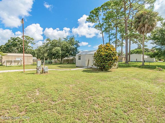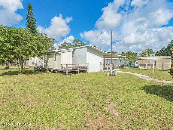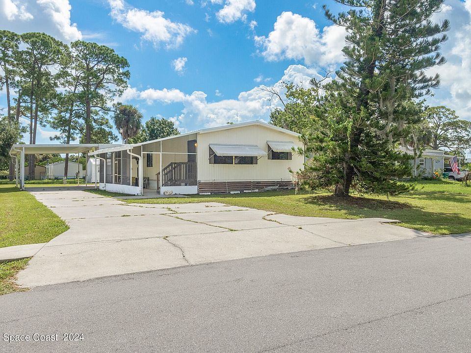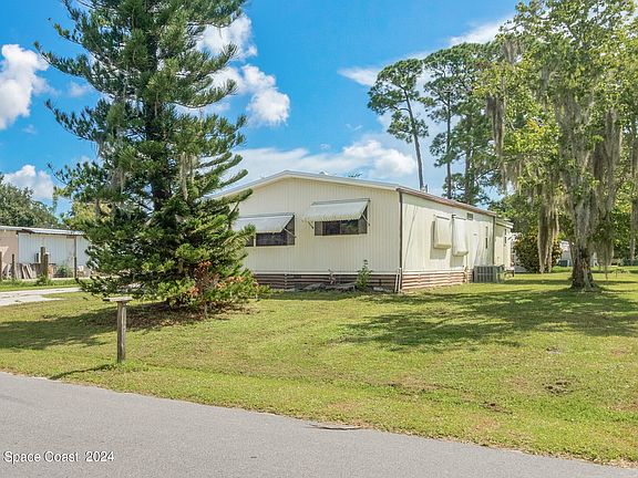 Looking for a mobile home where you own the lot, no pet or age restrictions, and are close to everything beaches, shopping, and I95 ? Check out this furnished 2-bedroom, 2.5-bathroom mobile home sits on a .26-acre lot and features new flooring, 2023 metal roof and 2023 AC. The open living and dining area leads to a kitchen with a breakfast bar, built-in, eat-in space, and pantry. Additional amenities include a laundry room, 10x20 shed, screened porch, outdoor screened-in kitchen area, carport, storage room, irrigation well, wheelchair ramp and fenced on 3 sides.