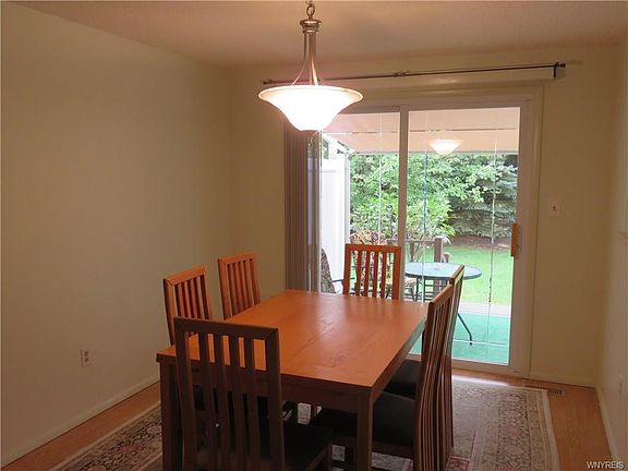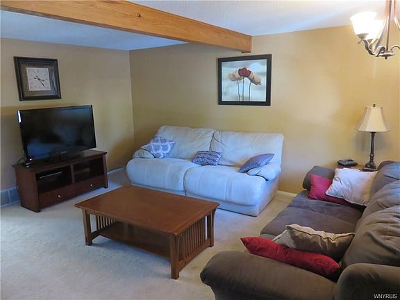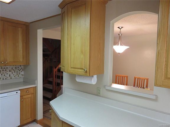 No HOA!! Updated, bright and very well maintained. Foyer with closet, Living Room with beam, 1/2 bath, Kitchen with pass thru to dining room -lots of cabinets and counter space. Dining room has hardwood floors & sliding glass door to deck. Private yard backs up to pond. Large master bedroom with dressing table, walk in closet and completely renovated full bath. 2nd bedroom with wall of closets. Full finished basement with built in's, glass block windows and bar. Private back yard with large shed for storage. Updates include roof '15, windows '13, furnace '08. You won't be disappointed!!Showings start Sunday 3/25