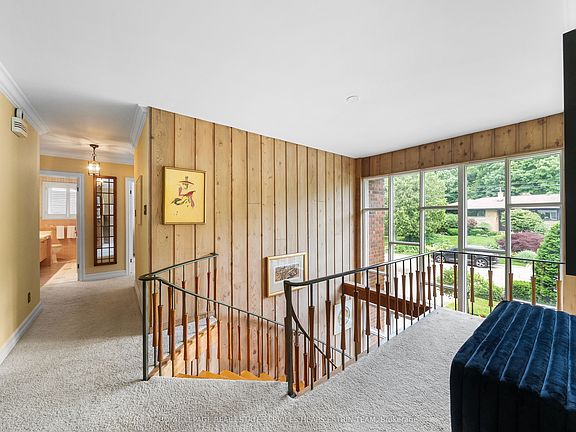 Welcome to 9 Audubon Court, a Mid-Century Modern Retreat Among the TreetopsPerched above a lush ravine on a large 60-by-230-foot lot, this architecturally distinct mid-century modern home offers a sense of seclusion and serenity just steps from an expansive ravine trail network, including direct access to Earl Bales Park, and in close proximity to all the shops and amenities of Yonge and Sheppard. With its striking proportions, floor-to-ceiling glass, and seamless integration with nature, this residence feels like a treehouse in the sky, designed for both inspired living and effortless entertaining.The main floor features a light-filled family room with panoramic windows, a walkout to the full-length deck, and a fireplace. A fourth bedroom or office, 2-piece powder room, bar area, and convenient laundry/storage space complete this level, enhancing everyday functionality.Upstairs, the expansive living room, with a second fireplace and direct deck access, offers dramatic views and flexible gathering space. A dedicated dining room and bright eat-in kitchen with side entrance and picture windows round out this floor. Three well-proportioned bedrooms including a primary suite with walk-in closet and 3-piece ensuite, while a separate 4-piece bathroom serves the remaining bedrooms.The lower level includes an abundance of additional storage, and the home features a desirable two-car garage.Professionally landscaped gardens filled with mature perennials offer a lush, low-maintenance backdrop throughout the seasons. Located in a peaceful enclave surrounded by nature, this home presents an extraordinary opportunity to enjoy privacy, space, and architectural distinction, just minutes from everything.