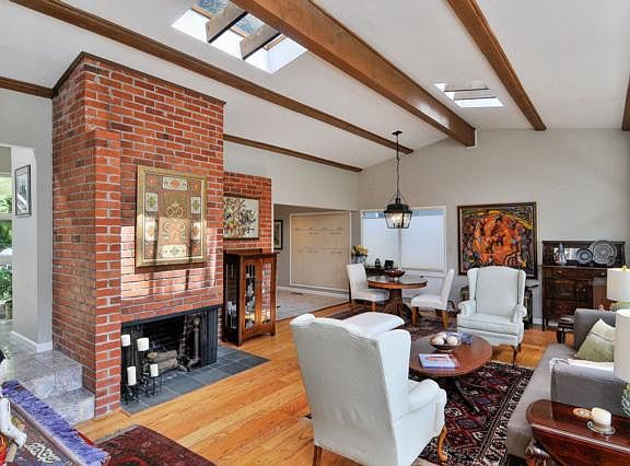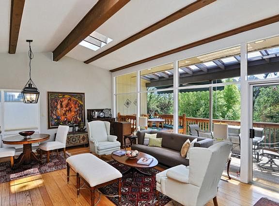 Serene & private mid-century with walls of glass, open floor plan, vaulted ceilings, updated kitchen and baths. Lower level family room and office with separate entrance. Large deck and lush level gardens for planting, entertaining, and play.