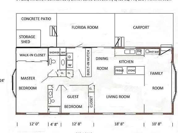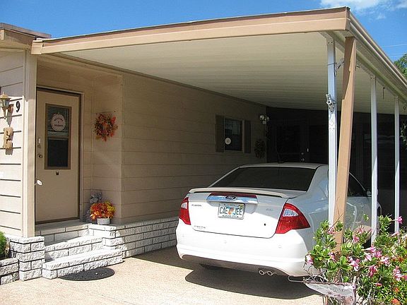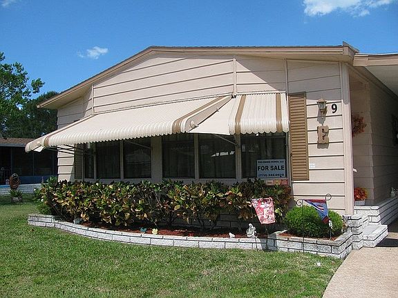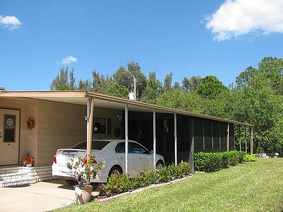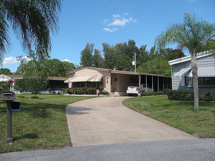 55+, non-pet section. Disclaimer: Pre-Owned Homes, LLC, is in no way affiliated with The Spanish Lakes Communities. 1984 Twin Manor, 2/2, 1,416 sq. ft., new shingle roof in 2005, 6’ x 8’ storage shed, and A/C unit serviced by Sea Coast, less than 10 years old. This unfurnished home with a wooded backyard is located on a corner cul-de-sac, non-pet street in a 55+ active senior community. The location gives you an extra-long driveway with plenty of parking for your vehicles and guests. You are also close to the clubhouse and entrance as this is one of the first streets in SLCCV. Flooring includes carpet in the main living areas and bedrooms, vinyl in both bathrooms, kitchen and laundry room. Appliances include newer fridge, newer stove, dishwasher, and newer built-in microwave in the kitchen, and a newer washer and dryer set in the laundry room. The master bedroom has the huge walk-in closet and en suite master bathroom. The guest room has an ample closet for storage. The guest bathroom has a new toilet. The 12’ x 22’ raised Florida room has an entrances from the carport and rear patio area, and interior doors to the dining room and laundry room. There are vertical sliding windows on three sides that let in a pretty nice breeze! And it also has a wall A/C unit if it’s too warm. The floor is covered with indoor/outdoor carpet. The storage shed is beyond the Florida room, on the concrete pad and under the roof. High on the back wall is a motion-sensor security light that shines into the backyard.