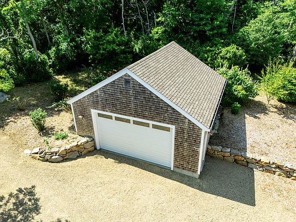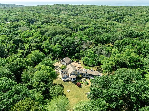 Beautifully sited on 3.4 acres, this distinctive Chilmark home offers a rare blend of privacy, comfort, and expansive living space, ideal for entertaining, both inside and outside. From the welcoming foyer, step into the dramatic vaulted living room, where wood-paneled ceilings, a gas fireplace, and abundant natural light create a warm and inviting atmosphere. French doors open seamlessly to an expansive deck, extending the living space outdoors. Adjacent to the living area, the dining room and well-appointed kitchen flow effortlessly into a fabulous screened porch--perfect for al fresco dining or relaxing in any weather. A cozy den and full bath are thoughtfully tucked off the entrance for additional flexibility. Beyond the kitchen, a spacious mudroom with a separate entrance leads to an outdoor shower and a generous laundry room with built-ins and a sink, offering exceptional functionality for island living. The primary suite is a private wing on the main level, featuring a large walk-in closet, a full bath, and a striking double-sided stone gas fireplace that connects the bedroom to an adjoining office or sitting area with a shiplap ceiling. With direct access to a wrap-around deck, this space is truly the crown jewel of the home. Upstairs, you'll find a large bedroom with a private deck and access to a shared full bath, along with two additional bedrooms. The full-length basement, offering over 2,200 square feet, and a detached two-car garage provide ample space for storage, hobbies, or future customization. With a 5-bedroom septic in place, there is room for expansion. Just moments from the Great Rock Bight Preserve, Menemsha, and Chilmark's renowned beaches, this exceptional property captures the essence of up-Island living private, serene, and quintessentially Chilmark. First Floor: The foyer entrance opens to the cathedral-ceiling living with a gas fireplace, skylights, and large picture windows which provide an abundance of natural light. The dining room and kitchen are open to the living room for easy entertaining. Enjoy the fabulous outdoor deck and screened porch, accessed through the dining and living rooms. There is a den and full bath off the entrance, and the laundry is conveniently located off the kitchen with access to the outdoor shower. The pièce de résistance is the primary suite, which spans the entire back side of the house. There is a walk-in closet, a full bath, and a double-sided gas fireplace servicing the bedroom and a shiplap ceiling office/sitting area. A wrap-around deck completes the primary suite. Second Floor: Three bedrooms and a shared full bath occupy the second floor. One of the bedrooms boasts a private deck and has direct access to the bath.