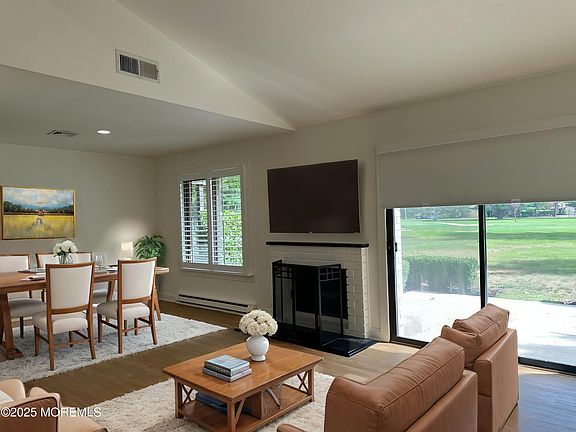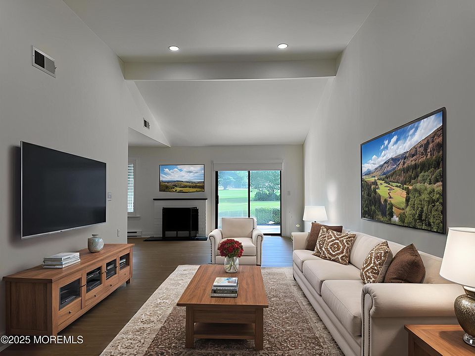 This beautiful end unit ranch, situated on the golf course, has been totally updated and comes with a garage too! Step inside the large living space with vaulted ceilings, brand new flooring, an updated white kitchen with SS appliances and brand new quartz countertops. Living area boasts a gas fireplace, new plantation shutters, and more. The bathroom has been totally renovated with a walk-in shower, new tile flooring and an oversized vanity too! This gated community includes a 9-hole golf course, tennis and pickleball courts, a walking trail, and a dock with lake access. The clubhouse offers a fitness center, pool, sauna, and billiards. Minutes away from Red Bank's restaurants, theaters, and shopping and only 20 min from the Jersey Shore. WOW! (Photos virtually staged). Call today!