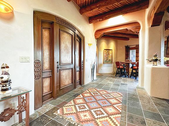 This extraordinary Santa Fe Estate is situated in the renowned Estate III of Las Campanas, offering the epitome of luxury and the comfort of Santa Fe Hacienda-style living. Upon arrival, a breathtaking courtyard welcomes you, with sweeping mountain vistas and expansive skies as your backdrop. The outdoor living spaces have been carefully designed to enhance your experience, featuring private portals, gardens, and patios, plus a cherished rooftop deck providing 360-degree views. In addition to the main house, a separate freshly painted 1,114 sq. ft. guesthouse awaits, complete with a full kitchen, washer and dryer, a custom murphy bed, a delightful portal, and patio for the ultimate in guest comfort, whether for short or extended stays. This custom-built home by Madera in 1998 boasts an array of features, including three Kiva fireplaces, soaring 16-foot ceilings, an inviting Chef's Kitchen with an eat-in area, formal dining space, and a combination of slate and wood flooring throughout. Brand new countertops in bathroom and kitchen. You'll find custom built-ins in every room, with bookshelves, desks, and a murphy bed thoughtfully incorporated in the office space. Traditional design elements like ceiling beams, vigas, latillas, lentils, and hand-carved doors adorn both the guesthouse and the main residence. Additional amenities include an oversized 3.5-car garage, radiant heating, and mini-splits throughout the property. The Club at Las Campanas membership is optional and subject to approval. Please note that there is not Kitech or Entran.