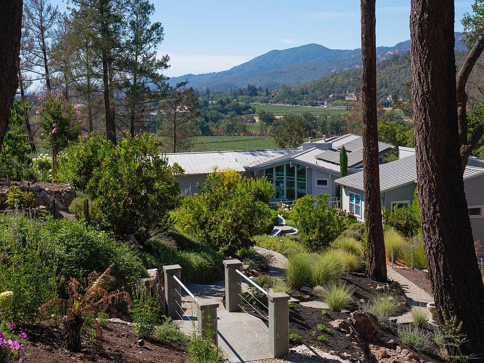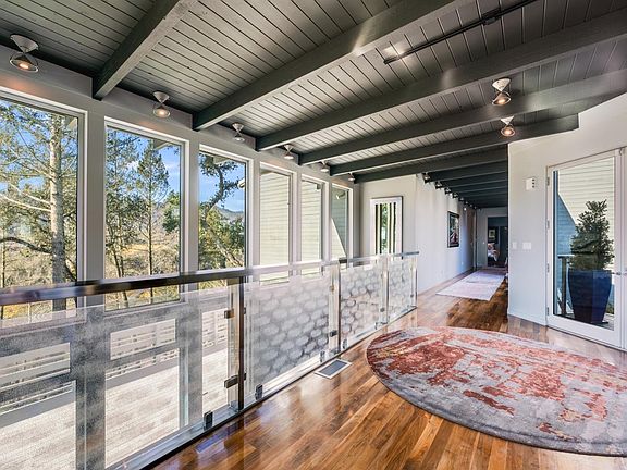 This private and gated sanctuary is the perfect blend of in-town living and hillside serenity. The updated Modern Craftsman retreat will immediately make you feel a cohesive indoor-outdoor living experience with expansive vistas through the many windows and abundant natural light. The main level includes an open living room, dining room, and kitchen, which open up to outdoor decks and grassy lawn perfect for al-fresco dining with panoramic mountain and valley viewsthree spacious bedrooms and baths complete the main level. Downstairs the home is an entertainer's paradise with a stunning wall-to-wall glassed-in wine cellar, bar, double-sided fireplace, and fireside seating on both sides. The lower level includes separate guest quarters with bath and an ample home office with built-in storage. Walkways perfectly carved into the nearly 5-acre property and two water features add to the meditative grounds.
