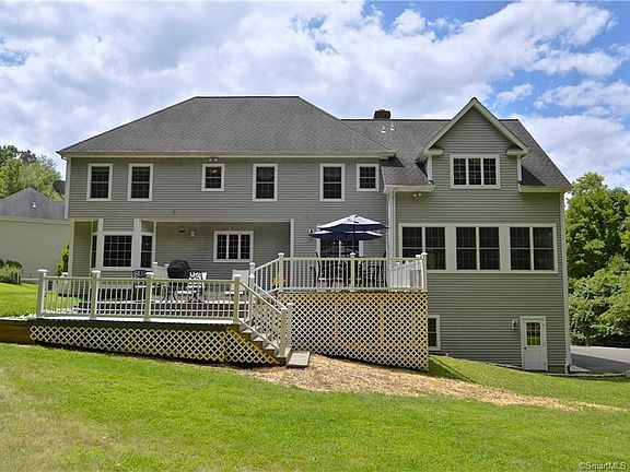 Custom colonial w/wood floors throughout in sought after Bramble Trail Cul-De Sac, is set back on a beautiful lot w/extensive stone work & pillars flanking the entrance, is walking distance to Lake Lillinonah. Large two story 20x15 foyer, overlooks the office w/walk-in closet and living/dining room combination w/crown molding, shadow box & tray ceiling detail, perfect for entertaining. The chef's high end, eat-in kitchen includes a subzero refrigerator, gas cooktop, double ovens, wine refrigerator, pantry cabinets, large center breakfast island, desk & sliding door to the oversized deck w/solar lighting. The oversized family room is surrounded by windows and boasts large field stone fireplace, perfect for cozy winters. The large sun room is a great location for relaxing, playing or entertaining. The oversized master bedroom suite has two walk-in closets & an additional closet, master bath w/double sink vanity, jetted tub & large walk-in shower and a sitting room that can be used as an exercise, study or relaxation room. Three other bedrooms are nice sizes w/large or walk-in closets. Two bedrooms share a Jack & Jill bath & the fourth bedroom has an en-suite bath. Second floor laundry is complete w/built in ironing board, folding table, sink & cabinets. Finished LL makes a perfect playroom/game room, w/wet bar, full bath & laundry closet. So many details w/ many custom features you don't often find today, including a winch for foyer chandelier and transom windows to name a few.