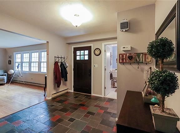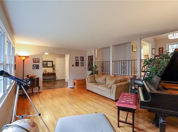 Charming and spacious split level ranch featuring a large master bedroom with full master bath, two additional large bedrooms, an updated eat-in kitchen, cozy family room with propane fireplace and sliders to a multi-level covered deck for (almost) all-weather enjoyment, radiant heat in the hall and guest bathrooms, and a formal dining room and living room. Electric heat can be converted to propane easily - existing air ducts also mean simple conversion to Central AC. Home also features a gorgeous slate entrance, winter heater coils on roof, a new water treatment system, beautiful wood floors as seen, a security system, a spacious 2-car attached garage, and great storage or leisure space in the clean and dry attic and basement levels. Home is situated at the end of a Cul-de-Sac, less than 2-minute drive to the Taconic Parkway (great Taconic commute).