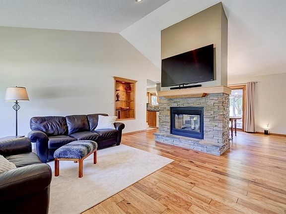 Enter into a spacious, open-concept living area with beautiful hardwood floors. The centerpiece of the living room is a stunning double-sided stone fireplace, providing warmth and character to both the living and dining areas. The kitchen features granite countertops, ample cabinetry, and modern stainless steel appliances, all of which stay with the home. Enjoy meals in either the formal dining area or the cozy breakfast nook, both conveniently located on either side of the kitchen.