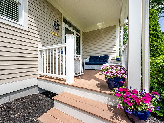 Exquisite Orleans style end unit at Southport! This home features luxury one level living with the upgrades you've been waiting for. Located at the end of a private cul de sac, the abundance of natural light and beautiful greenery from every window is truly impressive. This distinctive open floor plan provides a spacious kitchen, living and dining area perfect for entertaining. The kitchen features upgraded cabinets, granite countertops, a tile backsplash, stainless steel appliances, recessed lighting, a custom pantry and an extended counter and breakfast bar. The living area offers a gas fireplace surrounded by custom built in shelving and cabinets. The primary bedroom suite features upgraded closets, a large walk in shower with glass doors, quartz countertops with dual sinks and laundry room access. Wood floors throughout, plantation shutters, and upgraded lighting fixtures round off the main level. The finished lower level offers a half bathroom, an expansive den and a separate office space while providing plenty of storage space. Relax on the peaceful front entry porch or entertain on the spacious back deck. Enjoy the active adult 55+ community of Southport in time for Summer!