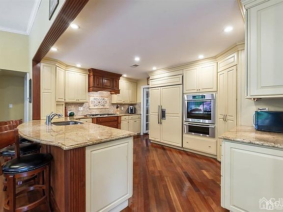 Custom home with additions providing an attractive exterior and a one-of-a-kind floor plan for your lifestyle set on a gorgeous, deep and level lot in the Lawrence Brook Development just minutes from being able to access the NJTP at Exit 9! The heart of this home is the relocated and expanded kitchen which flows into the cathedral ceiling Family Room. The kitchen has high end cabinetry, granite counters, pantry closet, breakfast bar and top of the line appliances including a Sub-Zero Refrigerator, Miele wall oven, warming drawer, microwave & dishwasher, steam oven plus a 6 burner cooktop. The family room is highlighted by built-in bookshelves, gas fireplace, plenty of natural light, a window seat and 2 sets of French doors leading to the expansive paver patio surrounded by mature landscaping for outdoor entertaining. A large formal dining room is conveniently located off the kitchen through a 2 way door or guests can access it through French doors from the foyer. The original kitchen location is now a cute home office tucked away in a quiet spot. All 4 Bedrooms are upstairs and generous sizes. A 2nd set of stairs comes up from the family room to just outside the primary bedroom suite which is highlighted by a vaulted ceiling, walk-in closet, balcony over- looking the large rear yard and a spa like bathroom outfitted with an air-jet tub & steam shower to unwind after a long day. One of the other bedrooms enjoys its own bathroom as well. The L-Shaped space on the mid-level offers a wide range of possibilities from playroom to TV room to formal living room. The partial basement is finished and is freshly painted and has new laminate flooring. There are laundry hook-ups in the basement and a second set of connections for an electric set upstairs for convenience (washers/dryers are not included with the sale). 2 car garage. Under ground lawn sprinklers help keep your lawn looking green with less effort.